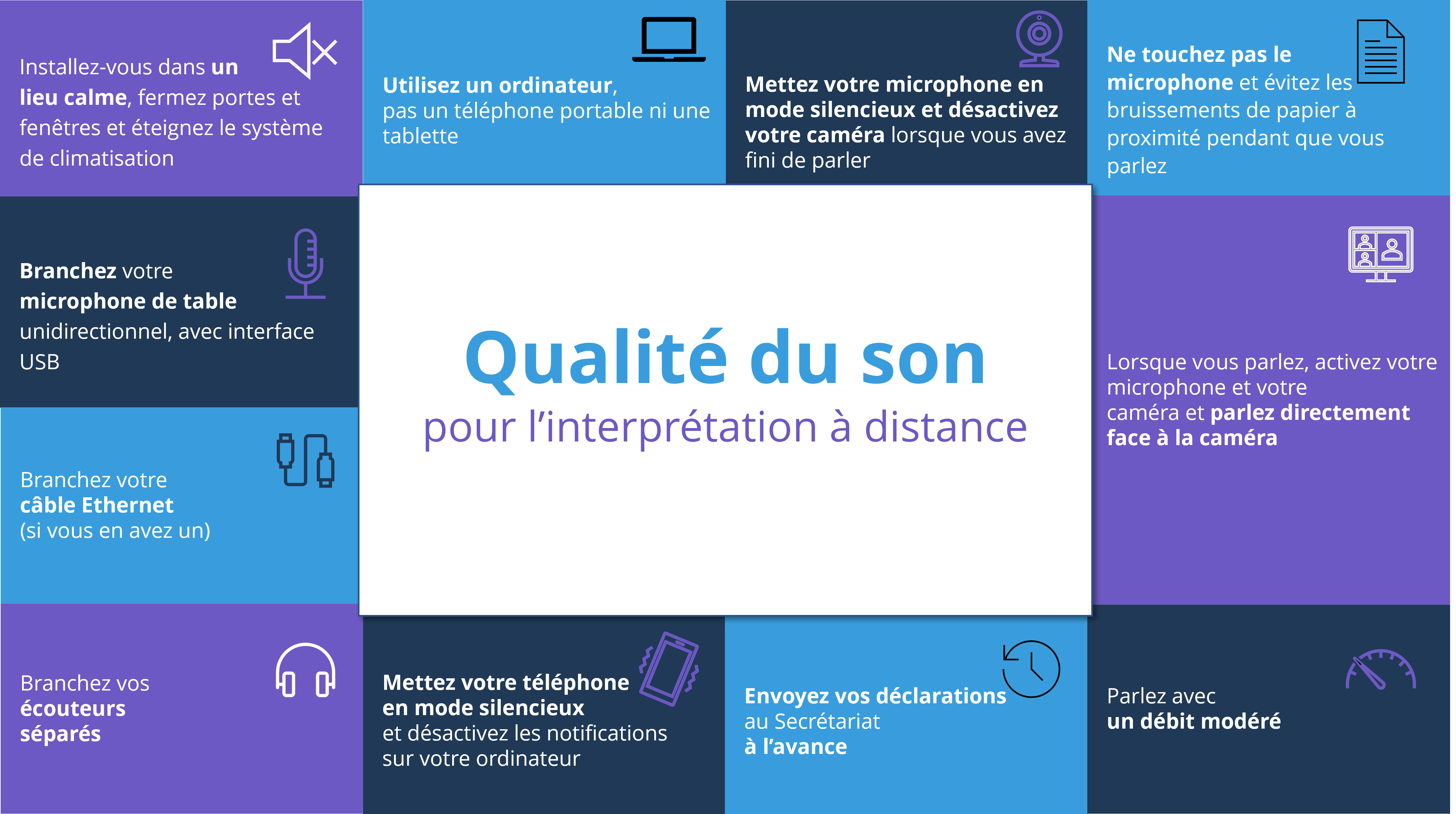 Afin que nous puissions continuer à promouvoir le multilinguisme et à assurer des services de qualité, nous vous saurions gré de bien vouloir observer les consignes que nous avons formulées. En prenant quelques mesures simples, vous pouvez contribuer à améliorer la qualité du son au profit des personnes qui vous écoutent et de celles qui assurent l’interprétation de votre message.
